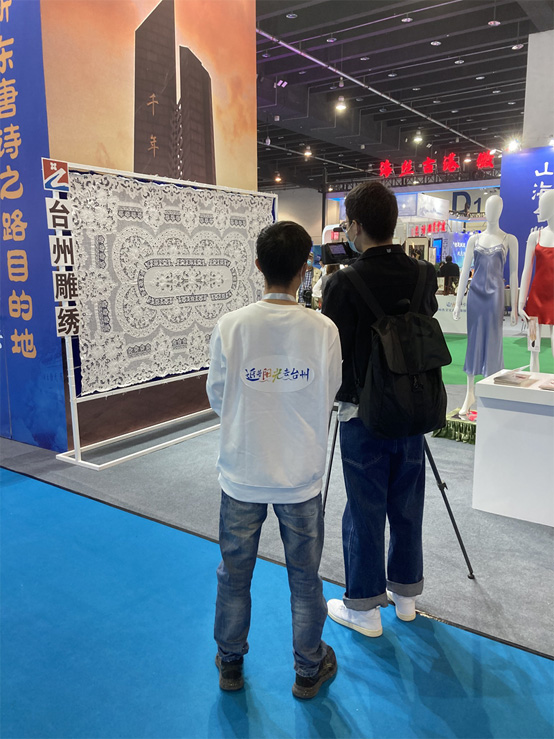 芸芝绣衣受邀参加本届博览会,向世界展示台州雕绣技艺。雕绣,顾名思义,即有雕有绣。雕,是在绣花片上根据原料的经纬线先行抽丝工艺,用绣线绣成蛛网状,形成各种雕档,突出主花,然后,镂剪去多余的布底,使花片呈现出生动活泼的图案。绣,是按照花稿设计要求,运用各种工针、工艺,一针一线绣成整齐细密的纹样。